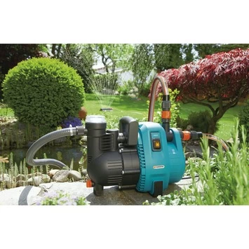De Gardena Comfort besproeiingspomp 4000/5 is een stille pomp voor gebruik rondom het huis. Deze krachtige pomp is veelzijdig inzetbaar en beschikt over uitstekende veiligheidskenmerken. De zogenaamde “safe-pump” functie bestaat uit: een LED weergave met waarschuwingsfunctie, automatische veiligheidsuitschakeling en geïntegreerde droogloopbeveiliging. Het voorzetfilter in de pomp voorkomt bovendien beschadigingen van binnen. Dankzij een thermische veiligheidsschakelaar, keramische afdichting en de dubbele isolatie tussen motor en loopwerk van de pomp, is een lange levensduur en veilig gebruik gegarandeerd. De pomp is uitgerust met een comfortabele draaggreep voor meer werkgemak, en de rubberen voetjes zorgen voor geluids- en trillingsdemping. De dubbele uitgang maakt het mogelijk om 2 apparaten aan te sluiten op de 33,3mm draad. Bovendien kunt u in geval van vorst de pomp eenvoudig leeg laten lopen met de aftapschroef. Een veelzijdige, betrouwbare pomp waar u lang plezier van zult hebben. Deze pomp is niet geschikt voor zout water, licht ontvlambare middelen of voedingsmiddelen.