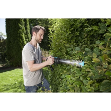 De Gardena elektrische heggenschaar EasyCut 450/50 is lichte en gebruiksvriendelijke heggenschaar en is perfect voor het snoeien van kleine heggen. Het compact design verzekert een perfect uitgebalanceerd evenwicht. De lemmetlengte van de heggenschaar is 50 cm met een maximale snijcapaciteit van 18 mm. Dankzij zijn ErgoTec handgreep kan ook in alle comfort de zijkant van de haag gesnoeid worden. De verbeterde mesgeometrie zorgt voor efficiënt, snel en net snoeien van takken.