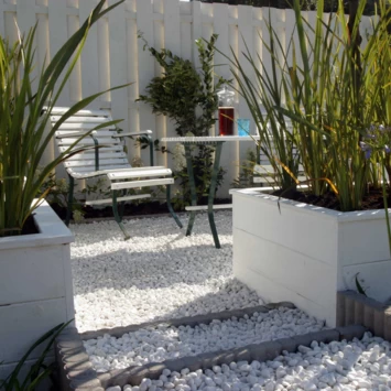 Carrara is een prachtige witte marmeren steensoort uit de marmergroeven van het Toscaanse Carrara. Carrara siergrind geeft een luxe gevoel en is veelzijdig toe te passen. Grind is door de hele tuin te gebruiken en kan verschillende doeleinden hebben. Zo kun je grind gebruiken als tuinpad of oprit, maar ook kunnen de kiezels een decoratieve functie hebben. Het fijne aan grind is dat je amper rekening hoeft te houden met drainage, want grind heeft van zichzelf een drainerende werking. Bij Nederlandse regenbuien heb je dus geen last van waterplassen die achterblijven. Het onderhoudsniveau van grind is relatief laag. Als het eenmaal ligt, ligt het gewoon goed. Gebruik een grindrooster om voor een stabiele ondergrond te zorgen en gebruik een worteldoek om vervelend onkruid tegen te houden.