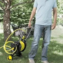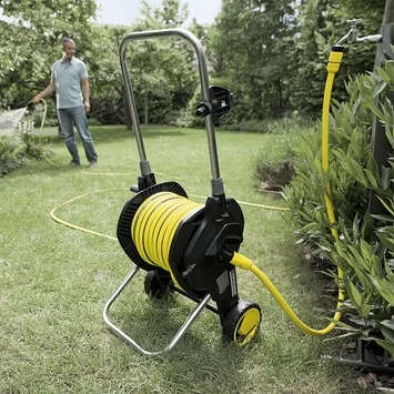 Op een simpele manier je planten water geven, doe je met deze Kärcher slangwagen HT 4.520 Kit 1/2” 20 m. Deze slangwagen is geschikt voor het eenvoudig bewateren van middelgrote tot grote tuinen. Dankzij de flexibele Kärcher PrimoFlex®-slang van 20 meter loop je met gemak je hele tuin door. De duwbeugel kun je in hoogte verstellen, zodat je altijd rechtop loopt. Bovendien zorgen de houder en de haak op de duwbeugel ervoor dat je al je toebehoren, zoals de sproeilans en spuitpistool, netjes vast kunt klikken. Doordat de slangaansluiting aan de zijkant van de slangwagen zit, voorkom je het mogelijk knikken van de slang of vervelende valpartijen. Wanneer je klaar ben met sproeien, vouw je de wagen in een handomdraai in elkaar om deze vervolgens compact op te bergen. Kortom: voor een soepele sproeibeurt kies je deze slangwagen.