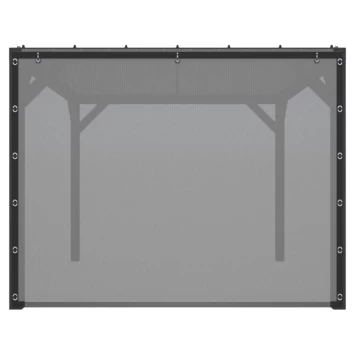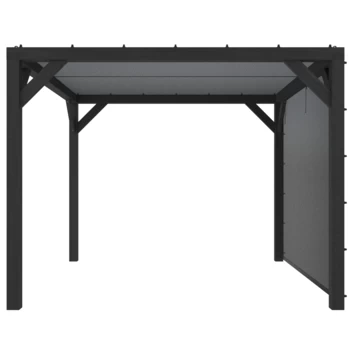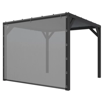 Pergola Silvano zwart gespoten vuren met zonweringdoek en zijdoek is 256 cm hoog, 328 cm breed en 324 cm diep, afhankelijk van de kant waar het zijdoek wordt bevestigd. De pergola heeft een stevige basis dankzij de halfhoutse hoekverbindingen en schoren. De robuuste staanders van 12 x 12 cm geeft de pergola een stoer karakter. Het kwalitatieve schaduwdoek biedt bescherming tegen de zon. Het zwart doek heeft een lichtgrijze en een donkergrijze kant. Je kunt zelf bepalen welke zijde je boven en onder plaatst, beide opties zijn mogelijk. Je kunt het schaduwdoek gemakkelijk bevestigen met zeilogen en knoppen. Het zijdoek wordt aan de bovenzijde bevestigd met een caravanrail en aan de zijkanten met zeilogen en knoppen. De 3 oprolriempjes aan de bovenzijde van het doek zorgen ervoor dat het doek tijdelijk kan worden opgerold. Zowel het doek aan de bovenzijde als aan de zijkant kunnen s ’winters er af worden gehaald, voor een langere levensduur.Â