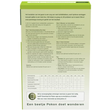 Dit Pokon Gazon renovatiepakket bevat alles wat u nodig hebt om uw gazon te renoveren, zonder omspitten. Dit handige 3-in-1 pakket bevat middel tegen mos, gazonmest en graszaad. Kale plekken die zijn ontstaan na de winter kunt u hiermee eenvoudig herstellen. Dankzij de gazonmest geeft u de grond een goede basis, het antimosmiddel weert het mos en het graszaad vult de kale plekken op/ Eén verpakking Pokon Gazon Renovatiepakket van 1750 gram is voldoende voor het herstellen van 25m2 gazon. Zo herstelt u uw siergazon, speelgazon en/of schaduwgazon in zonder dat omspitten nodig is.