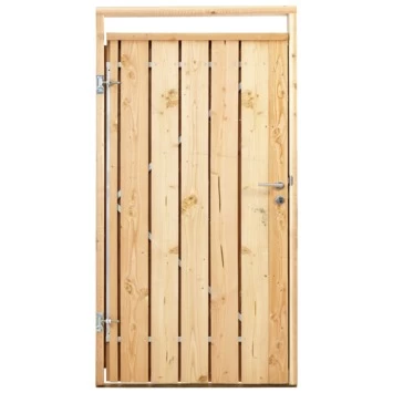 Heb je een houtbetonschutting van douglashout waar je een passende poort bij zoekt? Dan zit je met deze poort voor poort voor poort voor houtbetonschutting Douglas, breedte 110 cm linksdraaiend helemaal goed. Met een breedte van 110cm, waarvan de doorloopmaat ca. 100cm breed is, kun je door deze doorgang prima met een fiets, scooter of kruiwagen lopen. De poort is gemaakt van douglashout, een sterke houtsoort die je niet hoeft te impregneren, beitsen of verven. De poort heeft een metalen frame en wordt geleverd met een aluminium cilinderslot, metalen frame, hengen en verstelbare duimen, zodat je de deur eenvoudig zelf vast kunt zetten. De poort is linksdraaiend en heeft de scharnieren links zitten, wat inhoudt dat de poort vanuit de tuin gezien naar binnen toe opent.