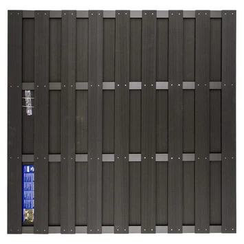 Schutting HKC is gemaakt van Hout Kunststof Composiet. Dit materiaal is samengesteld uit natuurlijke vezels en polymeren en combineert daarmee de beste eigenschappen van kunststof en hout. De schutting is heel duurzaam, kleurvast en onderhoudsarm. De schutting heeft een antraciete kleur, waardoor het een moderne uitstraling geeft. De schutting is 1 meter 80 breed en 1 meter 80 hoog. Het bestaat uit 17 massieve HKC-planken die 11,5 cm breed en 9 millimeter dik zijn. Hierdoor geeft deze schutting veel privacy. De latten zijn bevestigd op 4 aluminium tussenlatten. De schutting is geschroefd met roestvrijstalen schroeven en wordt geleverd inclusief roestvrijstalen vlechtschermsteunen. De combinatie van het materiaal en de bevestigingsmethode zorgt ervoor dat de schutting een levensduur heeft van ongeveer 15 jaar.