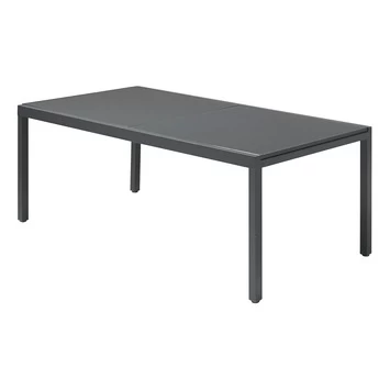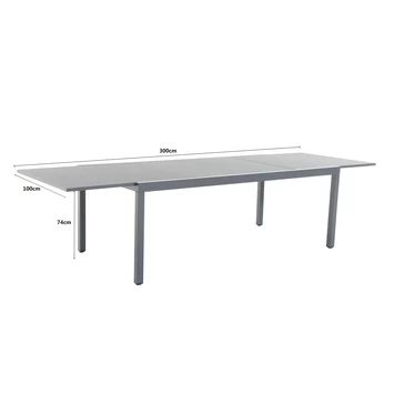 De tuintafel Livorno is gemaakt van antraciet metaal en heeft een glazen tafelblad. Dit blad is gemaakt van zes centimeter dik veiligheidsglas, en is dus extra stevig. Het blad is uitschuifbaar waardoor hij 3 meter lang wordt. Ruim genoeg om met acht personen comfortabel aan te kunnen eten. Dankzij de strakke, maar toch elegante vormgeving past de tafel Livorno uitschuifbaar in vrijwel elke tuin.Bij de tafel zijn bijpassende tuinstoelen verkrijgbaar. Een stapelstoel, die met een recht design prima past bij de tafel en een standenstoel waarin u lekker aan tafel kunt plaatsnemen, maar waarin u ook heerlijk languit kunt liggen.