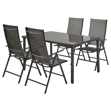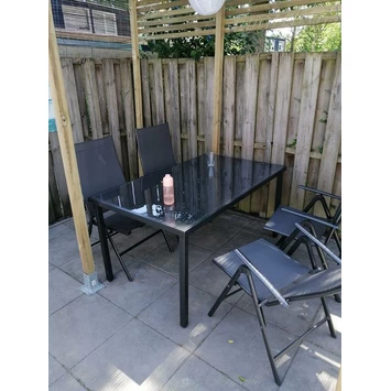 Met de Tuinset Nantes ben je direct voorzien van een complete set, om er zomers intensief gebruik van te maken. De Tuinset Nantes bestaat uit een tafel met glazen blad en stalen frame (150×90 cm) plus 4 standenstoelen met een textileen zitting. De stoelen zijn te verstellen in 3 verschillende standen en inklapbaar, waardoor deze gemakkelijk op te bergen zijn. De set is zeer onderhoudsvriendelijk en weerbestendig. Kortom, met deze luxe buitenset ben je verzekerd van comfort!